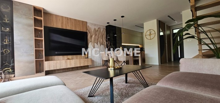 Dom wyposażony jest w ogrzewanie podłogowe, panoramiczne okna, rolety zewnętrzne, fotowoltaikę, alarm, monitoring wewnętrzny i zewnętrzny. Nieruchomość usytuowana jest w spokojnej, zielonej okolicy, w otoczeniu lasów i nowej zabudowy, a jednocześnie bardzo dobrze skomunikowana z głównymi drogami dojazdowymi.