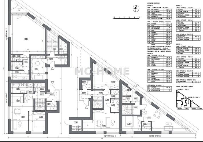 W każdym z budynków zakłada się wydzielenie 2 lokali- łącznie koncepcja zakłada budowę 8 lokali (7 lokali mieszkalnych i 1 usługowy), tak aby stworzyć kameralne osiedle