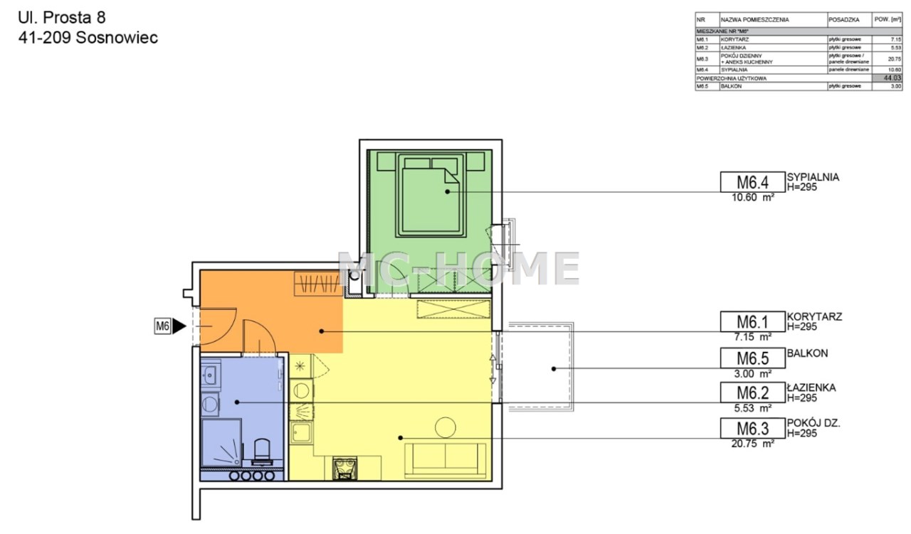 - M6 pow. 44,03m2 pokoje: 2, balkon: 3,00m2