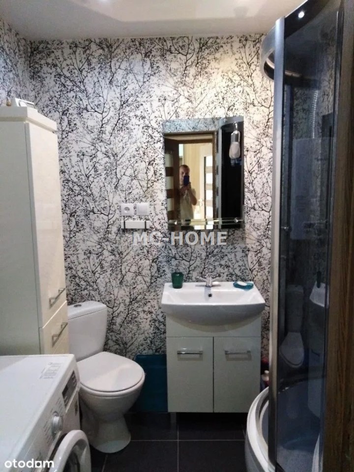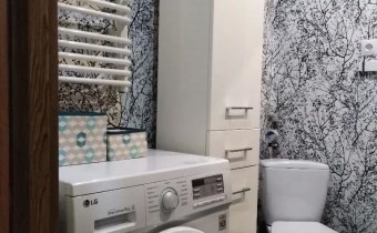 WC, kabina prysznicowa z hydromasażem, umywalka z szafką, pralka.