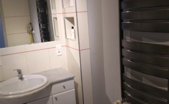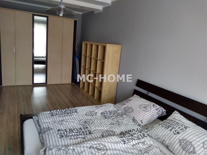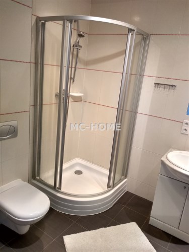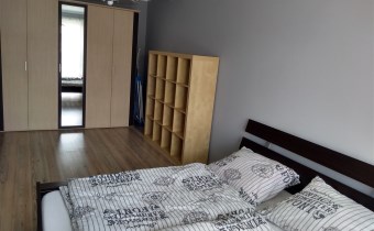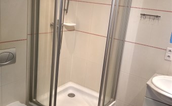 - W sypialni dwuosobowe łóżko, regał, pojemna szafa. W łazience prysznic oraz pralka.