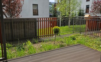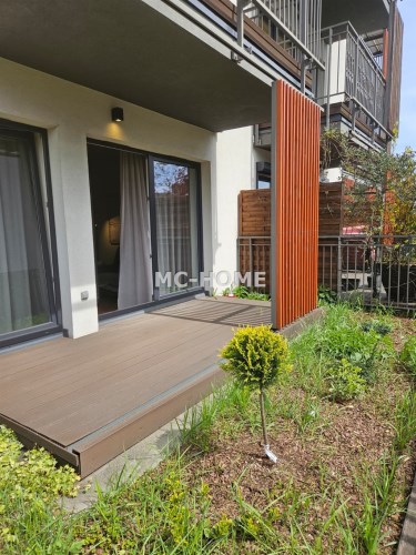 Dużym atutem nieruchomości jest przestronny taras o powierzchni ok. 25 m², z częścią zieloną oraz drewnianą strefą wypoczynkową.